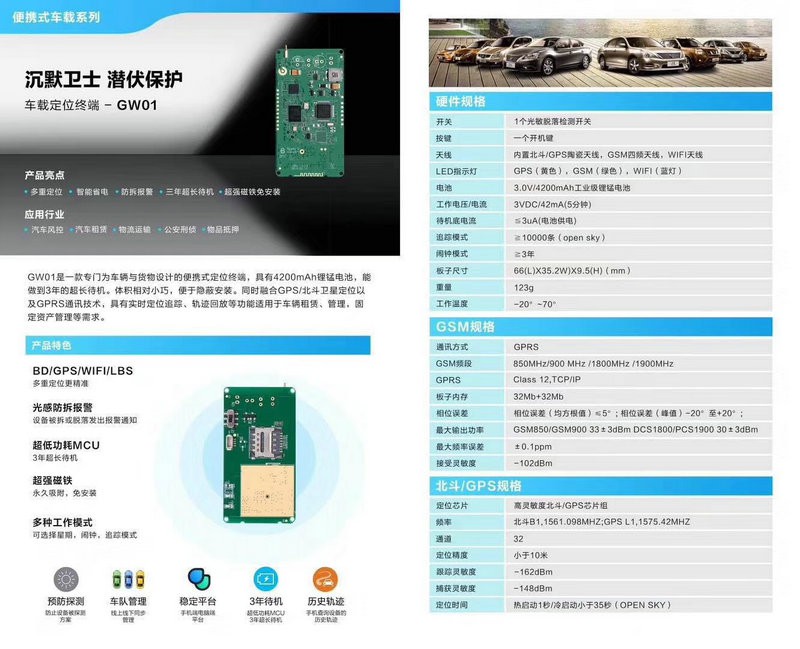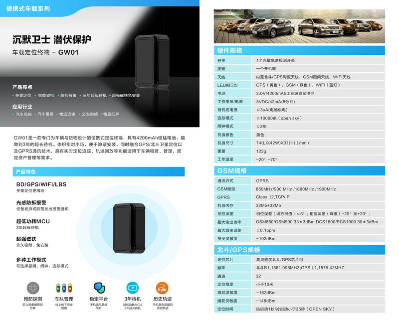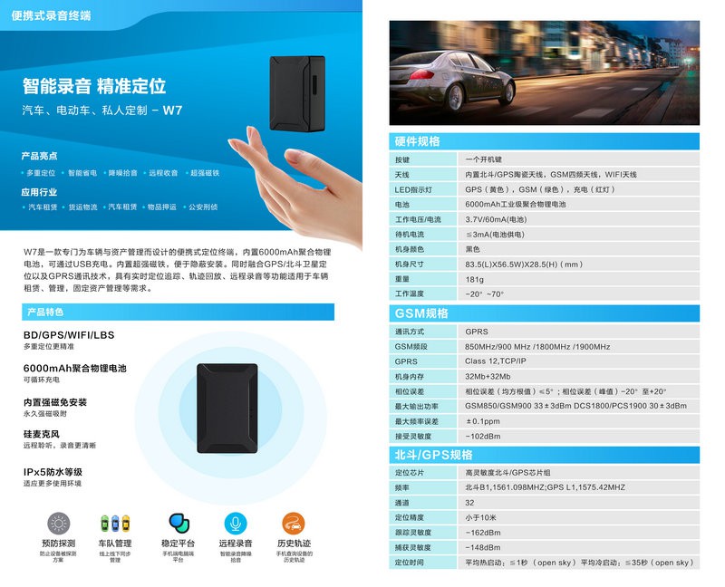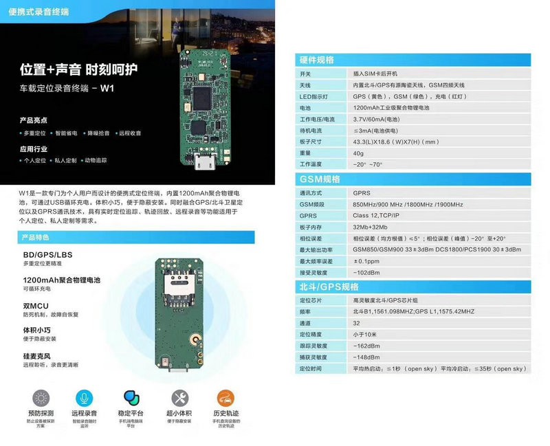 W1是一-款專門為個人用戶而設(shè)計的便攜式定位終端,內(nèi)置1200mAh聚合物鋰電池,可通過USB循環(huán)充電。體積小巧,便于隱蔽安裝。同時融合GPS/北斗衛(wèi)星定位以及GPRS通訊技術(shù),具有實(shí)時定位追蹤、軌跡回放、遠(yuǎn)程錄音等功能適用于個人定位、私人定制等需求。