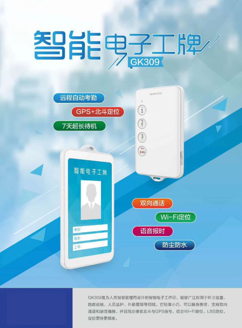 工卡定位器GK309是為人員智慧管理而設(shè)計的智能電子工作證,能夠廣泛應(yīng)用于環(huán)衛(wèi)巡查、路政巡檢、人員監(jiān)護(hù)、外勤管理等領(lǐng)域。它輕薄小巧,可以隨身攜帶,支持雙向通話和語音播報,并且同步接收北斗與GPS信號,結(jié)合Wi-Fi定位、LBS定位,定位更快更準(zhǔn)。